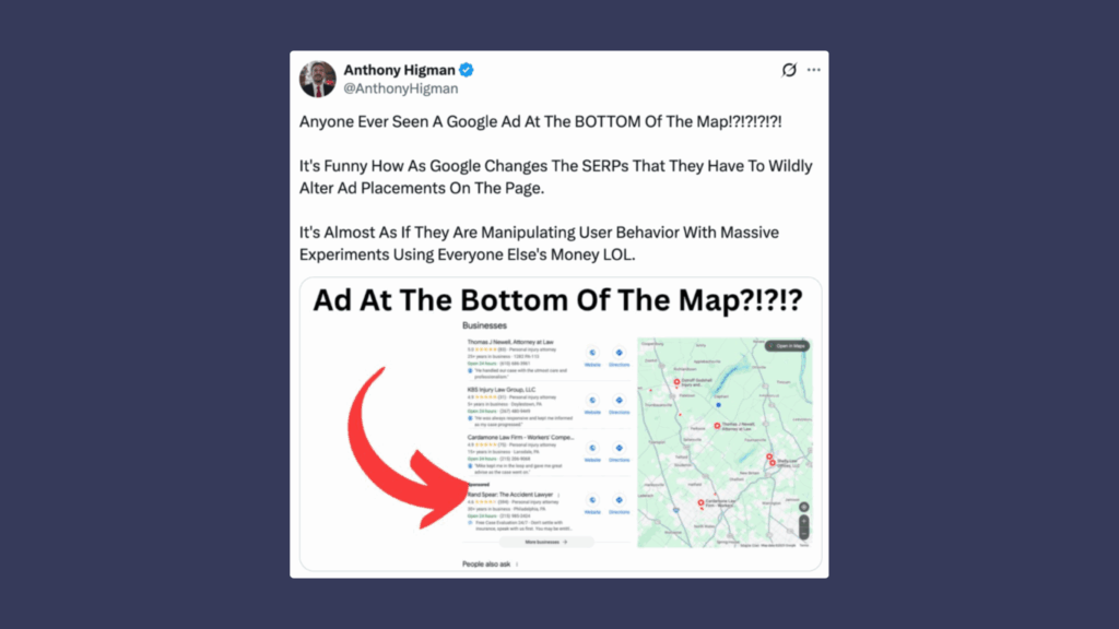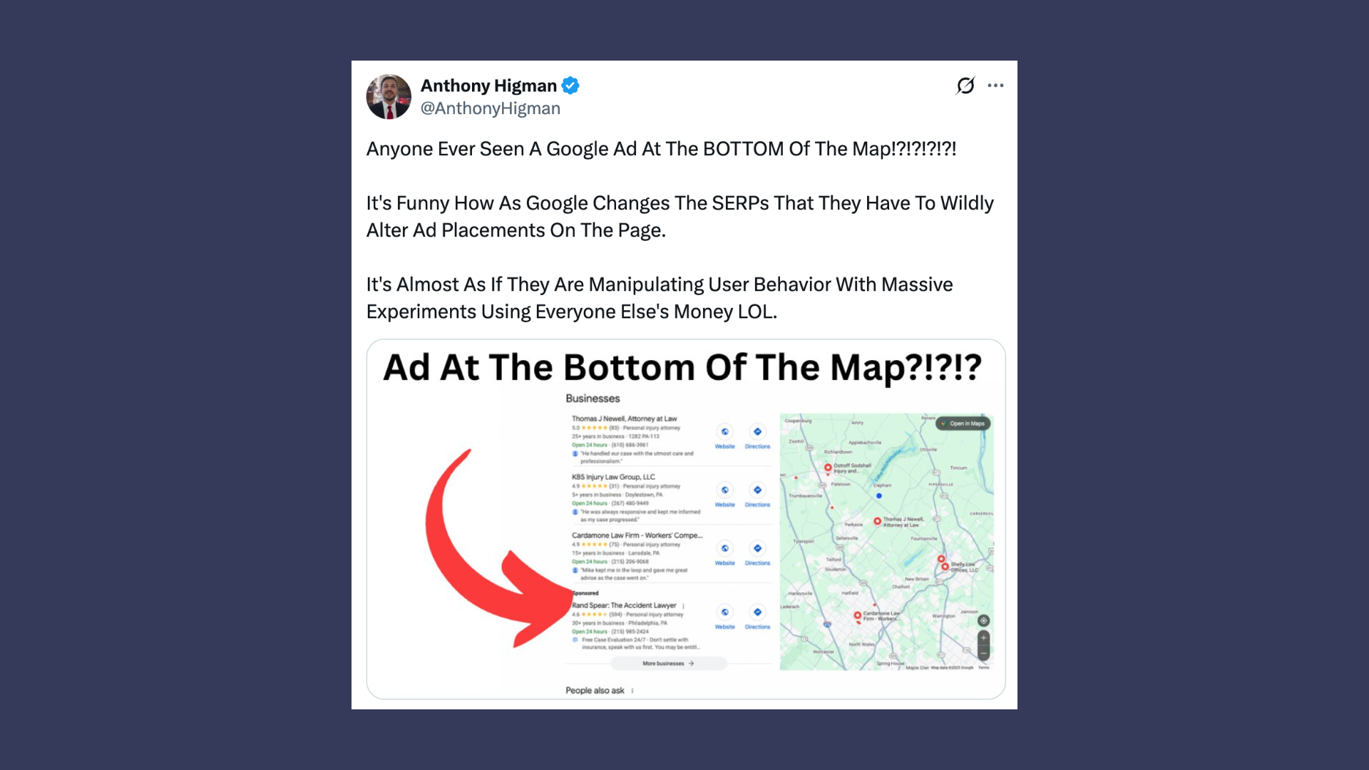- A new Google Maps layout is being tested with ads now showing beneath the map pack instead of above it. This is again another consequence of increased ad placement testing during one of the biggest shifts to ever occur on Google. As Google pushes more Ai features onto the main search page, this changes how users interact with results and where they scroll to next. So we believe this change is also due to the larger changes invovling Ai.