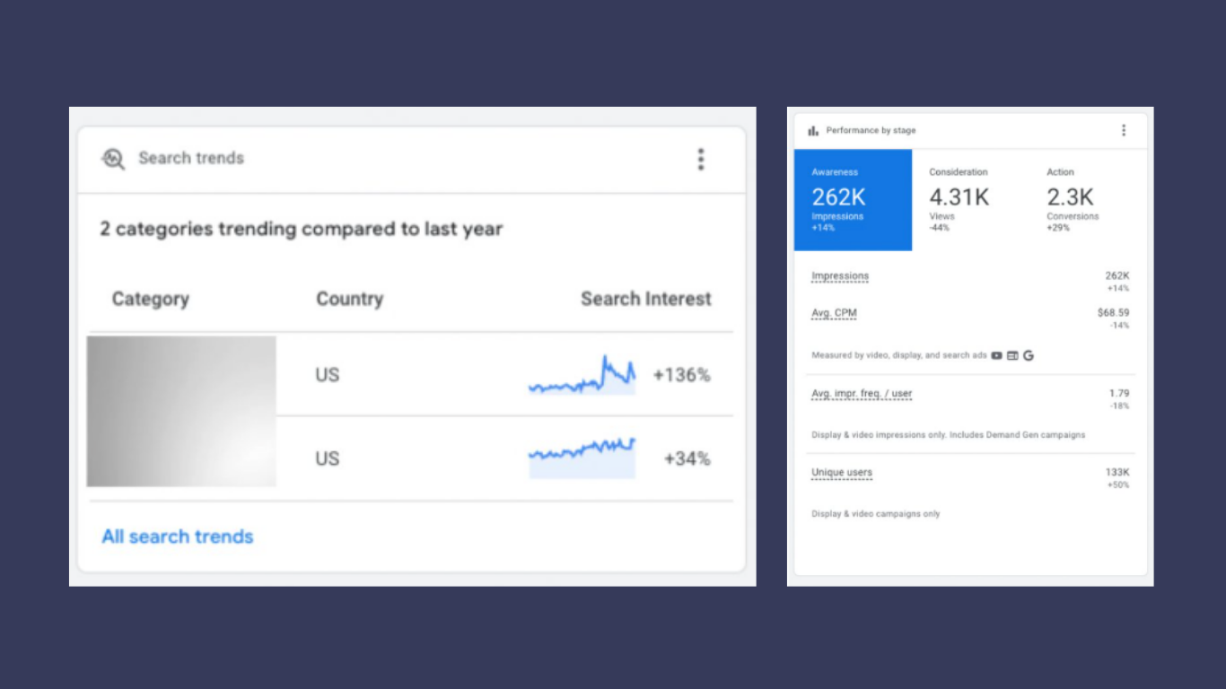 The Trends section highlights how key metrics are moving year over year, which is great, but it also sort of resets expectations. Instead of asking “Why is performance down this month?” Google is now steering you toward comparing everything against last year’s data.