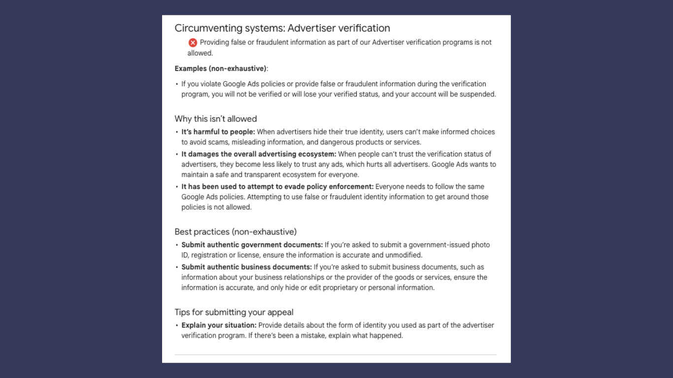 - Maintaining ecosystem trust: Misrepresenting verification status undermines confidence in Google Ads overall, which impacts all advertisers.