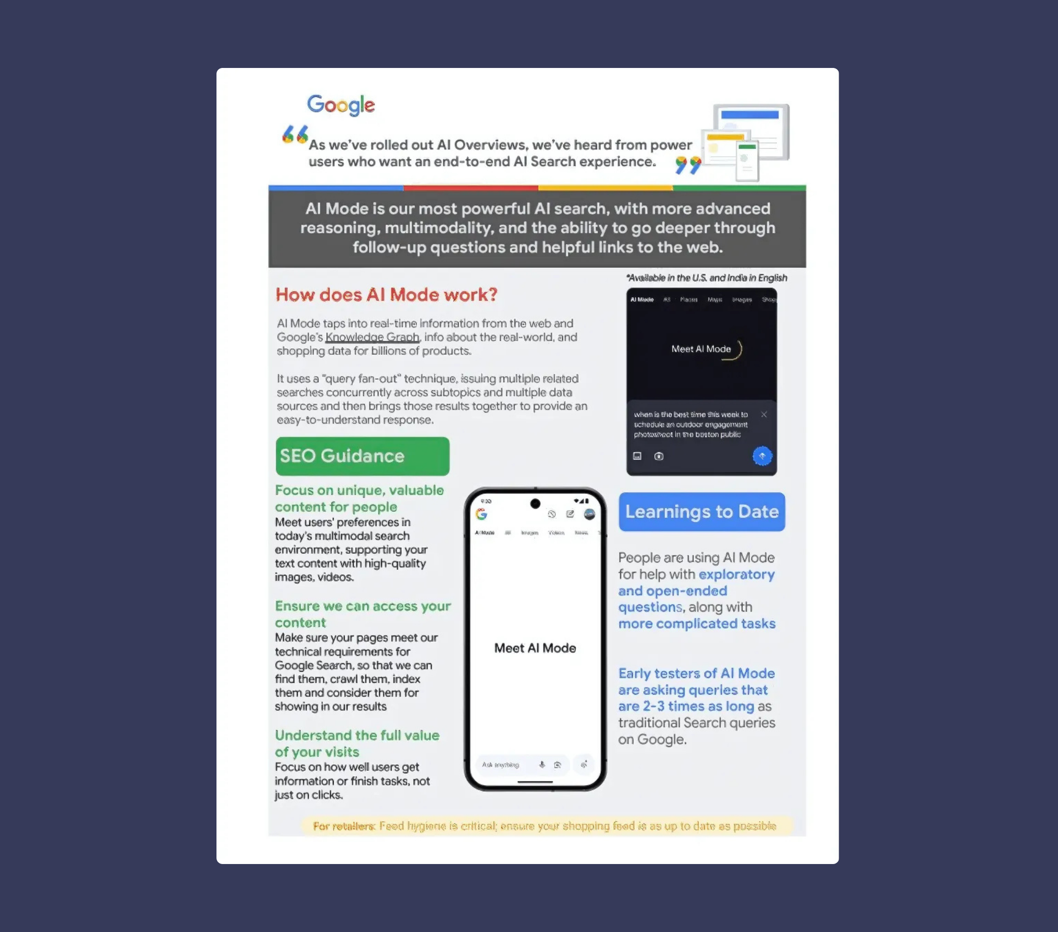 It finally happened—Google’s internal documents leaked, and it looks like “AI Mode” ads are on the horizon, with a rollout rumored for Q4. The pitch? Smarter automation that takes your campaign goals, assets, and data signals and uses AI to dynamically generate, test, and optimize ads in real-time. Think PMax, but on steroids.