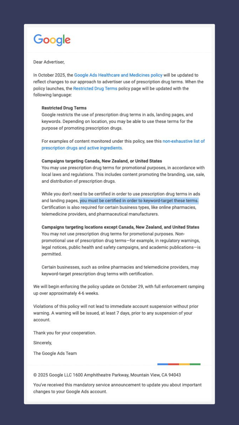 Our take: This one stings. Legal advertisers in the mass torts space will feel this most, as keyword targeting around drug-specific lawsuit terms becomes restricted. The policy effectively cuts off traffic from users searching with branded drug names — often the highest-converting segment.