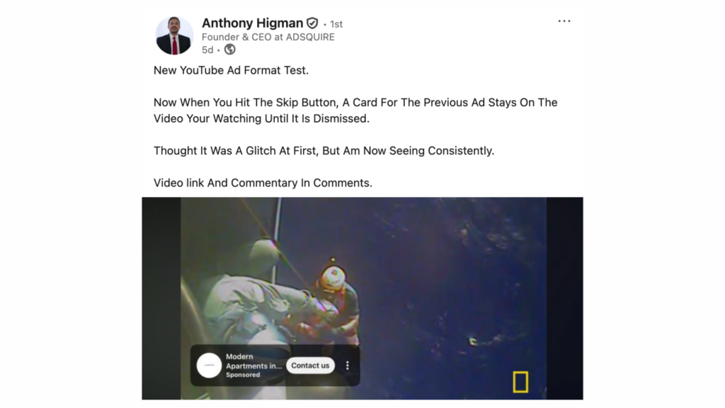 YouTube is experimenting with a new format that changes how skippable ads behave. Instead of disappearing entirely when a user presses “Skip Ad,” a sticky banner overlay tied to the advertisement remains visible inside the video player.